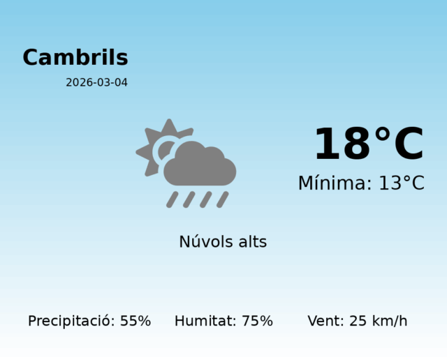 Avui, a Cambrils, es preveu un dia amb condicions meteorològiques variables. La temperatura màxima serà de 18°C i la mínima de 13°C, oferint una jornada relativament suau però amb possibilitat de canvis sobtats.