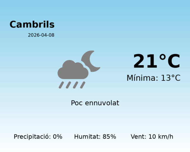 Bon dia, Cambrils! Avui us portem la predicció meteorològica per al 8 d’abril de 2026. Prepareu-vos per un dia tranquil pel que fa al clima.
