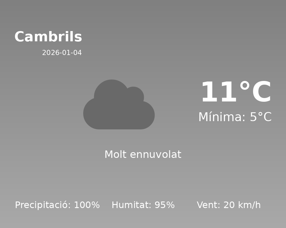 Benvinguts a la predicció meteorològica del dia d’avui per a la ciutat de Cambrils. Prepareu-vos per un dia marcat per la pluja i el vent, amb unes condicions meteorològiques que requeriran que us abrigueu i planifiqueu els vostres desplaçaments amb atenció.