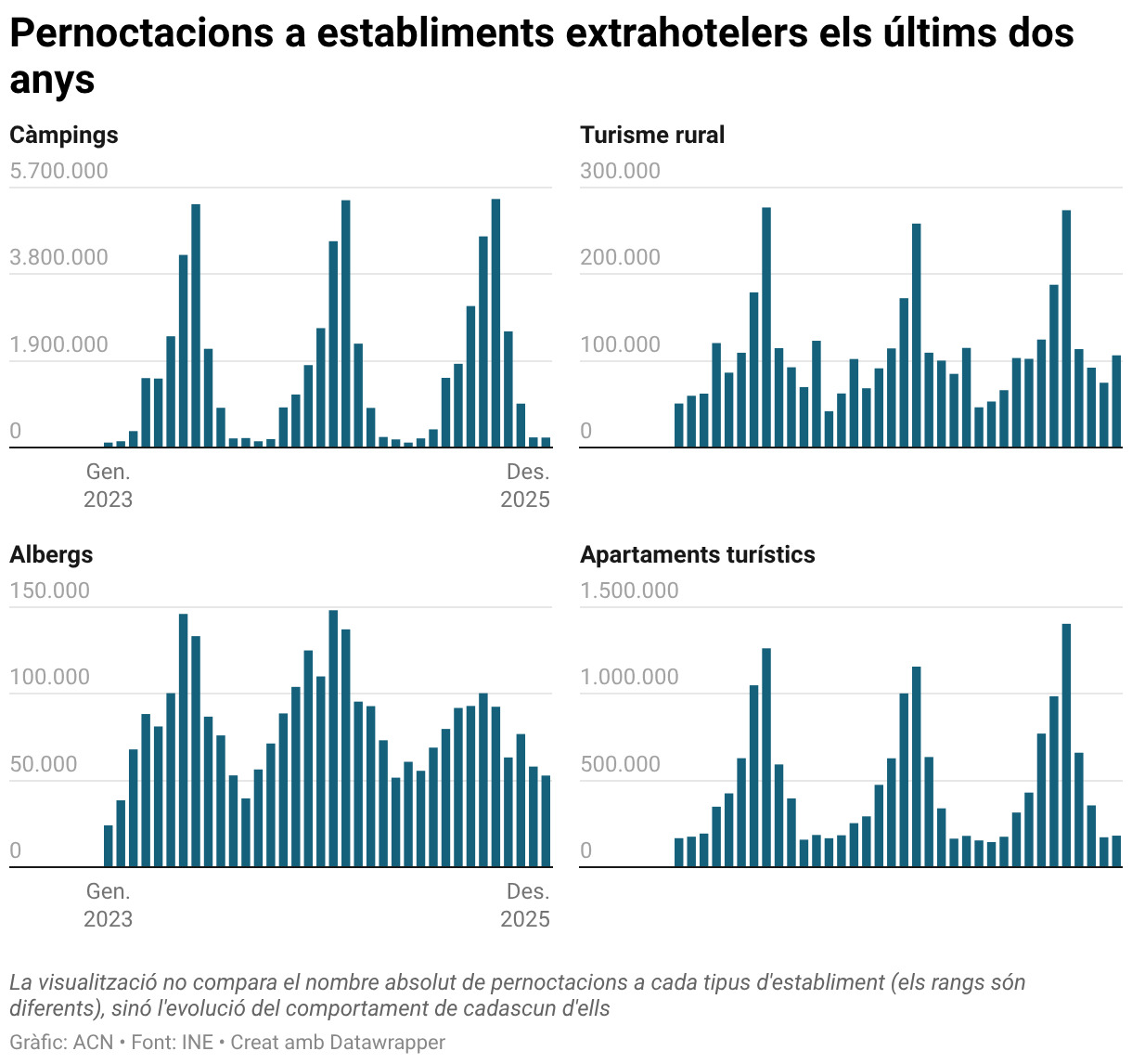 D’altra banda, els allotjaments de turisme rural van acabar el 2025 amb 496.764 usuaris, caient per sota del més de mig milió registrat el 2024 (-3%), però registrant més pernoctacions, 1.344.252 (+1,8%), així que l’estada mitjana ha estat més llarga. Un 83% dels usuaris han estat residents a Espanya, i el desembre va acabar amb 41.403 viatgers (-9,4%) i 106.371 pernoctacions (-7,4%).