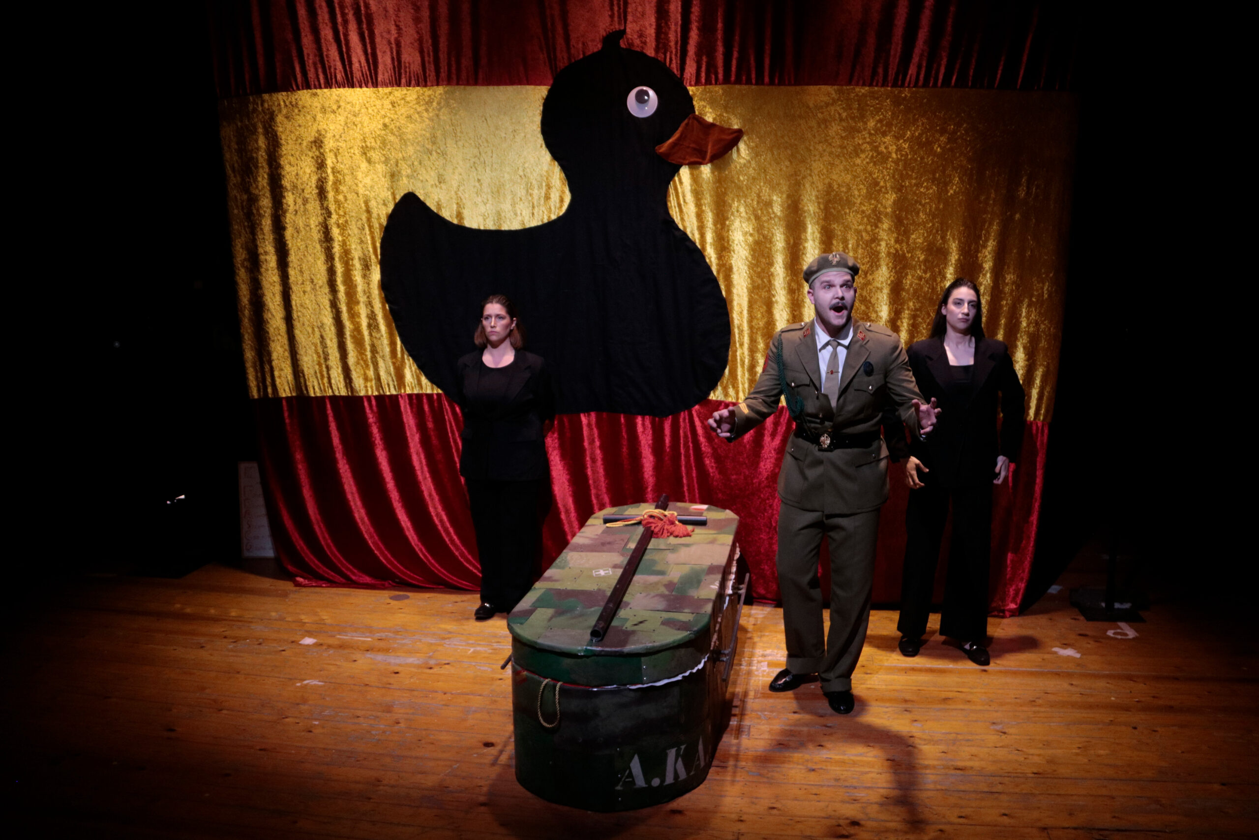 Un taüt militar al mig l’escenari de la Sala Trono centra totes les mirades, on també s’exhibeix una gran bandera espanyola amb la figura d’un ànec de goma tintat de negre que dona el tret de sortida a l’obra ‘Francisco Frasco’. És el punt de partida d’una sàtira interpretada pels actors de la companyia Àkrida Produccions Marc Pinyol, Marta Puig i Farners Moreno, que ofereixen un final imaginatiu a la mort, enterrament i exhumació del dictador franquista.