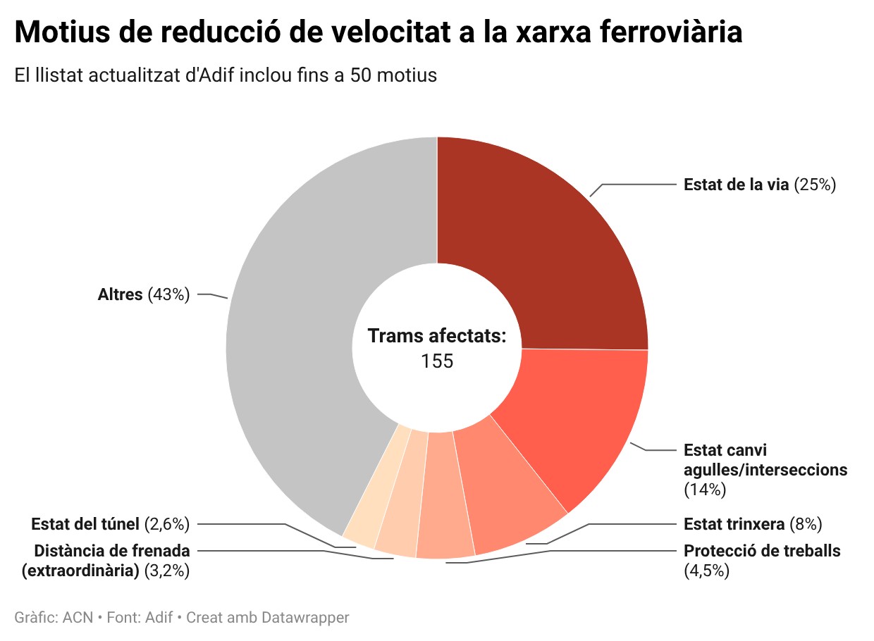 Segons les dades a les que ha tingut accés l’ACN, actualment consten una cinquantena de motius per establir una reducció de velocitat en un tram de via. El principal, relacionat amb l’estat de la via (sense especificar), en un de cada quatre talls (el 25,2% dels casos). El segon, té a veure amb l’estat del mecanisme de desviament o canvi d’agulles i les travesses que permeten la intersecció entre dues vies, que ara mateix comporten 22 reduccions de velocitat (el 14% dels casos). L’estat de les ‘trinxeres’ (excavacions al sòl per suavitzar el pendent i afavorir el pas del tren) són la tercera causa de reducció de la velocitat, amb una dotzena de casos (el 4,5%) segons la darrera actualització d’Adif.