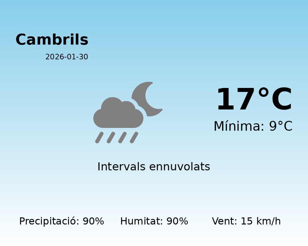 El cel estarà força cobert, etiquetat amb l’estat “13”, el que implica condicions molt ennuvolades. A més, s’esperen precipitacions significatives, amb un 90% de probabilitat de pluja. Això fa necessari portar paraigües i roba impermeable si es planeja sortir.
